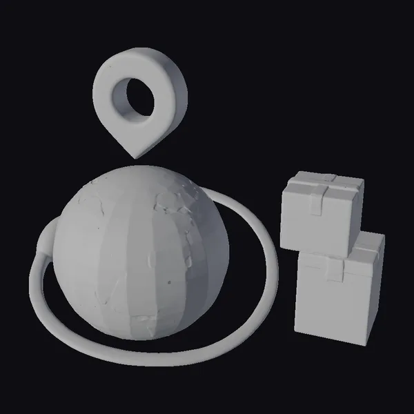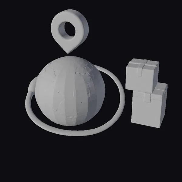 At the heart of this stylized representation is a detailed, blue-hued globe, encircled by a smooth, dark blue ring that suggests movement and dynamism. A pinpoint location marker hovers above, pinpointing a specific destination, while two white packages with gray ribbons sit neatly to the side, symbolizing the delivery process. The combination of these elements—globe, ring, marker, and packages—creates a compelling visual narrative of global shipping and logistics. The model’s clean lines and vibrant colors make it an excellent choice for projects requiring a modern, professional aesthetic, such as animations, games, or marketing materials focused on delivery, logistics, or global connectivity.