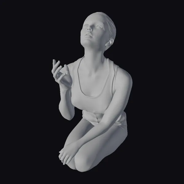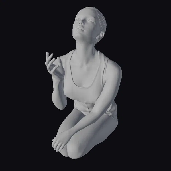 Perched in a poised sitting position, this glossy female figure exudes tranquility with one leg tucked under the other and a delicate hand gesture. The model’s surface boasts a uniform, high-gloss finish that reflects light, emphasizing her curves and detailed anatomy. Her facial features are subtly defined, contributing to her serene and contemplative mood. The monochromatic color scheme adds to her timeless appeal, making her a versatile asset for various creative projects. Whether you’re working on a game, animation, or design project, this model can bring a touch of elegance and realism. Her detailed structure makes her suitable for close-up shots or scenes where realism is key.