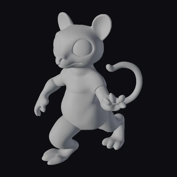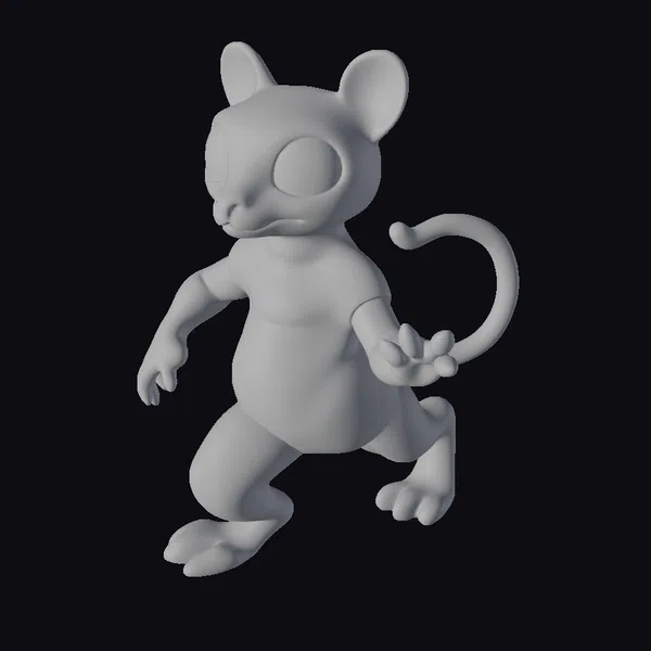 Perched on its hind legs, this stylized mouse creature exudes a sense of dynamic energy, its body angled to one side as if caught in mid-movement. The black surface of its fur is speckled with neon spots in a variety of colors, including pink, blue, green, and yellow, which appear to glow with an inner light. The creature’s large, round eyes are black, adding to its stylized and somewhat mysterious appearance. Its red nose provides a pop of color against the dark fur. The neon spots are scattered randomly across its body, giving each part a unique, almost bioluminescent quality. This model would be perfect for projects requiring a fantastical or sci-fi element, such as games, animations, or virtual reality experiences.