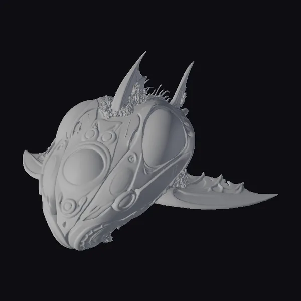 Gaze into the eerie glow of this fantastical aquatic head, adorned with metallic spines and iridescent blue accents. Its otherworldly appearance is sure to captivate and inspire. The intricate details and glowing orbs evoke a sense of mystique and wonder.