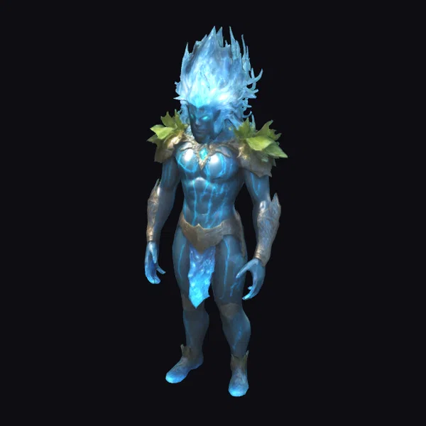 Standing proudly with a physique that mirrors the rugged beauty of the Earth’s landscapes, this avatar’s body is a mesmerizing blend of crystalline structures and glowing blue veins, suggesting a deep connection to the planet’s inner workings. The ice-like armor, complete with green leaf-like protrusions, adds a touch of mysticism and a hint of nature’s resilience. The avatar’s pose, with its sharp, claw-like fingers and dynamic stance, speaks to its potential for action and movement, making it a compelling addition to any project that seeks to explore themes of nature, power, and mysticism. Whether for games, animation, or design, this model offers a rich source of inspiration.