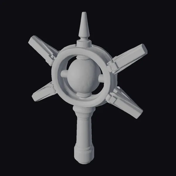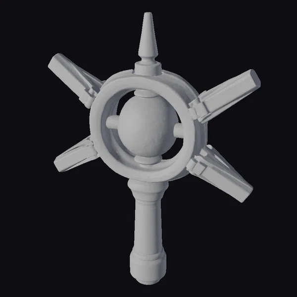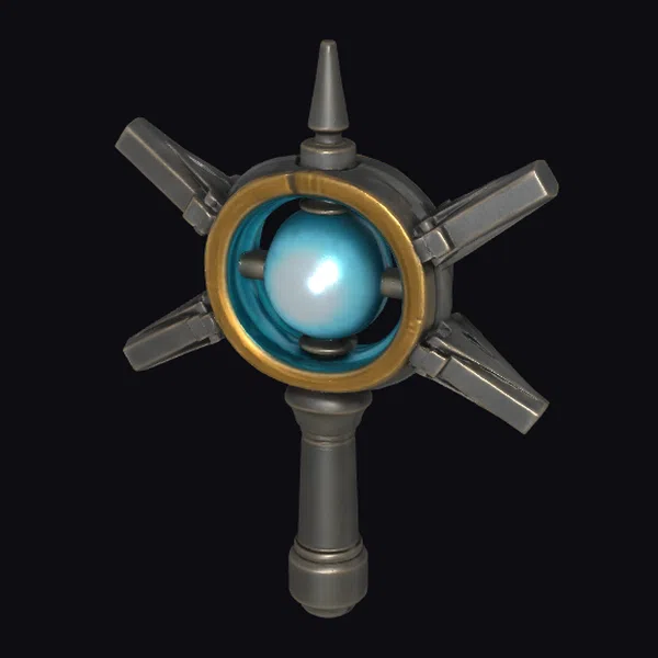 In a dramatic pose, the Glowing Blue Energy Scepter commands attention with its intricate design. The scepter’s dark grey handle leads up to a central orb chamber, where a glowing blue sphere seems to hover within a gold-rimmed, cage-like structure. Four mechanical arms extend from the central body, giving the scepter a dynamic, high-tech appearance. The metallic textures and sharp lines evoke a sense of advanced technology, while the glowing orb adds an element of mysticism. This 3D model would be perfect for use in sci-fi games, animations, or designs where a futuristic, powerful artifact is needed. Its detailed structure and realistic materials make it suitable for close-up shots or as a key element in a futuristic scene.