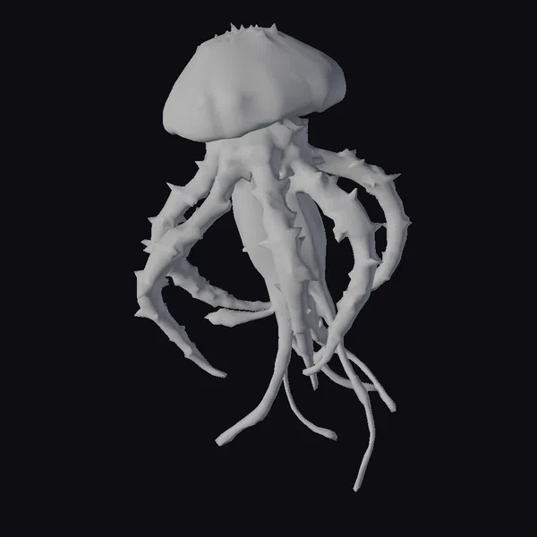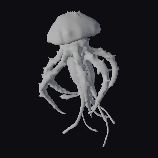 In a majestic pose, the creature showcases its intricate details: the dome-shaped head glows with a soft, pulsing light, while the six arms, four of which are tipped with menacing spikes, stretch out in a dynamic, curved motion. The runes etched into its body seem to shift and shimmer, casting an otherworldly aura around the creature. As it appears to hover in mid-water, the creature’s bioluminescent capabilities are on full display, casting an ethereal glow across its surroundings. This 3D model would be perfect for use in games, animation projects, or 3D printing, where a touch of fantasy and mysticism is needed. Its unique blend of horror and fascination makes it an excellent choice for projects aiming to evoke a sense of wonder or unease.