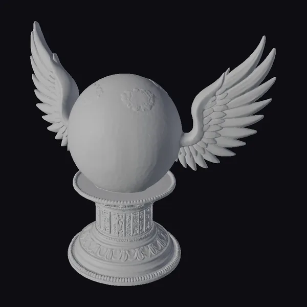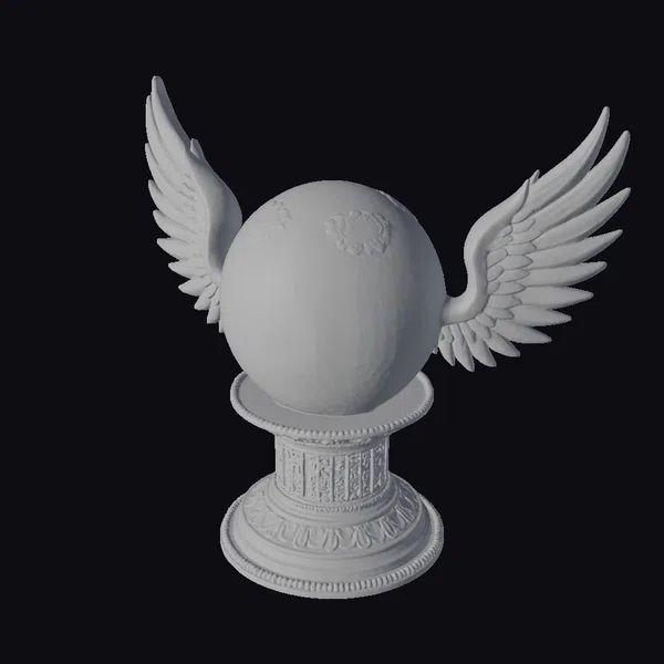 In a stunning display of fantasy artistry, this 3D model presents a glowing blue orb nestled within a sturdy, ornate pedestal, from which a pair of magnificent wings emerges, as if frozen in mid-motion. The orb itself is a marvel of detailed design, with swirling patterns of light and darker blue rings that seem to shift and shimmer. The pedestal, with its intricate carvings, adds a sense of history and mystique, grounding the piece in a sense of ancient power. The wings, transitioning from dark to light metallic tones, add a dynamic, almost lifelike quality. This model is perfect for use in games, animations, or virtual reality experiences where a touch of magic is needed. Its high level of detail and realistic textures make it suitable for professional projects requiring a high-quality visual element.