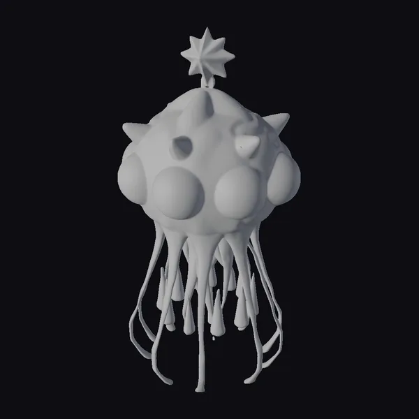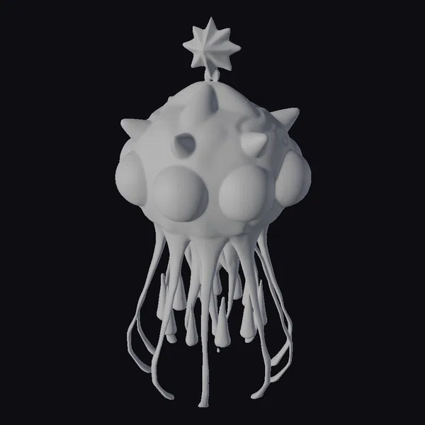 This captivating model presents a jellyfish-like celestial entity with a glowing, bioluminescent body that pulses with a soft, ethereal light. The entity’s rounded form is topped with a golden star, from which several tentacles hang, each embellished with small, orbiting planets. The surface of the body features several large, dark spheres that glow from within, surrounded by smaller, red, horn-like protrusions. The model’s intricate details and vibrant colors bring to life a fantastical, cosmic scene. Ideal for use in games, 3D printing, VR/AR experiences, animation, and design projects, this model adds a touch of magic and wonder.