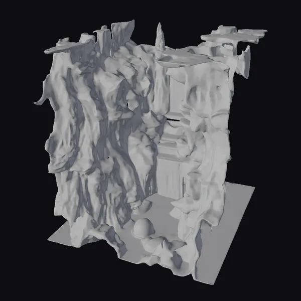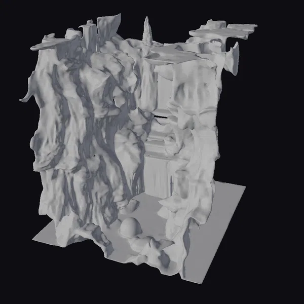 Deep within a mysterious, alien world, a glowing crystal cave diorama beckons with an ethereal allure. The rocky structure, with its jagged edges and rough-hewn surfaces, appears to be infused with an otherworldly energy. A floating waterfall cascades down the center, its crystal-clear waters glowing with a soft, blue light. The surrounding rocks and crystals emit a warm, red-orange glow, casting an eerie light on the dark, rocky floor. As the eye explores this sci-fi wonder, it becomes clear that this diorama is perfect for adding a touch of the extraordinary to games, 3D printing projects, VR/AR experiences, animations, or architectural designs. The unique blend of natural and fantastical elements creates a captivating visual effect that’s sure to leave a lasting impression.