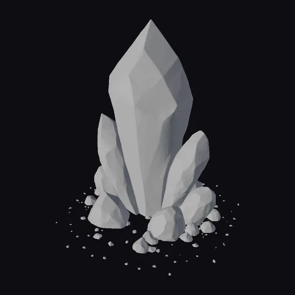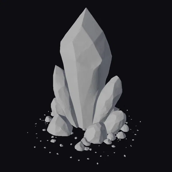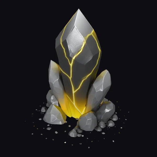 Deep within a mystical realm, a radiant crystal cluster emerges from the earth, its dark gray, faceted crystals sharply defined and bursting with an inner light. The central crystal, towering above its companions, features vibrant yellow veins that crackle with energy, as if lightning has been captured within its structure. The cluster sits atop a scattering of shattered rocks and debris, adding to the sense of raw power and ancient magic. The model’s intricate details, from the glowing yellow at the base to the shattered rocks around it, make it perfect for use in games, 3D printing, VR/AR experiences, and animation projects. Its unique blend of fantasy and realism invites viewers to ponder the secrets and potential hidden within its glowing heart.