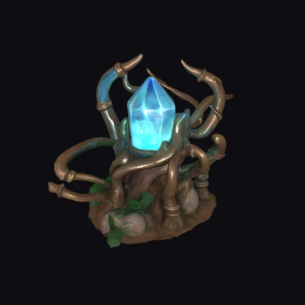 Perched atop a base adorned with stones and lush green leaves, the crystal core emits a mesmerizing light. The metallic structure, with its earthy tones and organic design, appears to be grown around the crystal, with curved, branch-like protrusions that add to its mystique. The model’s intricate details, from the texture of the crystal to the metallic sheen, invite the viewer to explore its potential uses in games, 3D printing, VR/AR experiences, and animation. The combination of natural and synthetic elements creates a compelling visual contrast.
