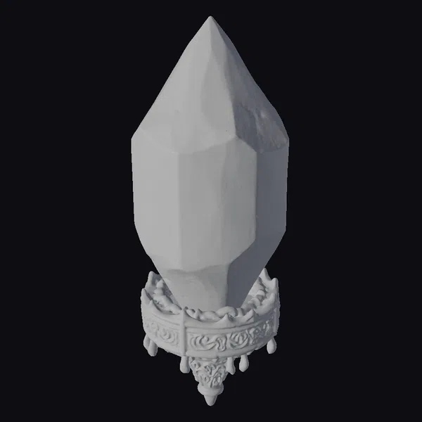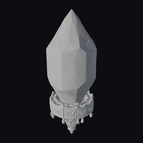 Perched on a richly decorated pedestal, the crystal orb commands attention with its pointed apex and multifaceted surface. The orb’s gray hue is punctuated by a network of silver lines, while two prominent blue-glowing sections pulse with a soft, mystical light. The pedestal itself boasts an intricate design, complete with small bells and a subtle blue gemstone at its tip. This captivating scene is perfect for games, animation, or VR/AR projects seeking to transport viewers to a realm of wonder. The model’s level of detail invites close inspection, from the crystal’s faceted texture to the ornate metalwork of the pedestal.