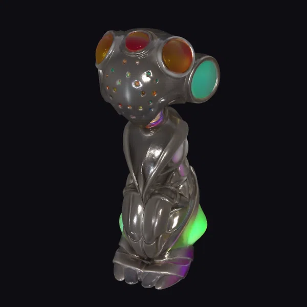 In a dynamic pose, with its body angled slightly forward and its head cocked to one side, this cybernetic guardian seems poised and alert. The metallic gray body is sleek and streamlined, with visible joints and panels that suggest advanced technology. The true showstopper, however, is its head: three large, circular panels glow with soft, pulsing light, casting an eerie yet captivating glow. The panels themselves shift through a mesmerizing sequence of colors – fiery reds and oranges, calming greens and blues – as if reflecting an inner light. Small, faceted gems scattered across the face add a touch of whimsy and wonder. This 3D model would be perfect for use in games, animation, VR/AR experiences, or 3D printing, offering a unique and eye-catching character that is sure to draw attention.