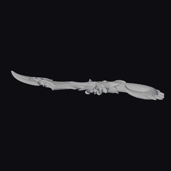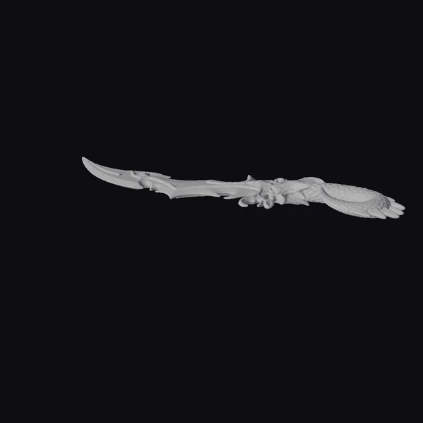 Positioned dynamically, the dagger’s curved blade slices through the air, its sharp edge gleaming with a subtle sheen. The hilt, a complex weave of metallic and dark, organic forms, seems to pulse with an inner light, a soft blue luminescence that hints at ancient power. Textures shift from smooth, polished metal to rough, almost scaly surfaces, inviting the eye to explore every nook. As a 3D model, this dagger is primed for use in games, print projects, VR/AR experiences, and animations, offering a versatile, high-fantasy element. Its abstract design makes it a standout prop for sci-fi or fantasy narratives.