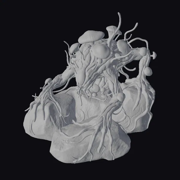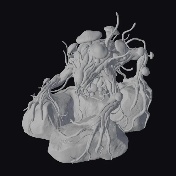 In a pose that exudes a mix of menace and mystique, the fungal creature sits atop a jagged rock formation, its body a mass of dark, organic matter. The surface of its form is adorned with glowing, neon-like tendrils that pulse with a vibrant, electric blue and green light. Several mushrooms, varying in size, sprout from its shoulders and back, their caps a deep, rich purple. The creature’s ‘face’ is a blend of humanoid and fungal features, with glowing tendrils weaving across it, suggesting a bioluminescent network. This model is perfect for projects requiring a unique, fantastical element, such as games, animations, or virtual reality experiences that demand a touch of the surreal and unknown.