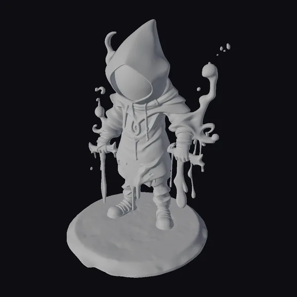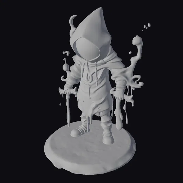 Perched atop a circular base that resembles a patch of murky swamp ground, the figure cuts a foreboding silhouette. The hood, pointed and voluminous, casts a deep shadow over the face, hinting at the darkness within. Glowing green tendrils of magic dance around the figure, infusing the air with an electric sense of power. The attire, a mix of tattered and armored elements, suggests a blend of mysticism and combat readiness. The figure’s stance, blades in hand, speaks of a readiness to face whatever darkness lies ahead. This model is perfect for projects requiring a touch of dark fantasy, from game environments to animated sequences, offering a rich source of inspiration for designers and creators.