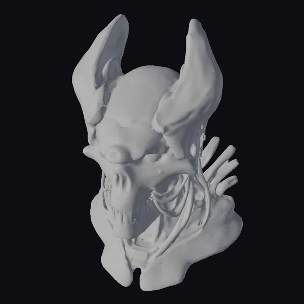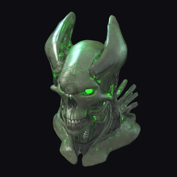 This intricately detailed skull bust is posed in a way that seems to emerge from the shadows, its green neon glow casting an eerie light on the surrounding environment. The metallic texture, complete with visible cracks and seams, adds a layer of realism to the fantastical design. The skull’s eyes and scattered green accents throughout the model pulse with a vibrant, almost malevolent energy. Ideal for use in games, 3D printing, VR/AR experiences, animation projects, or as a striking piece of digital art. The model’s unique blend of horror and sci-fi elements makes it a versatile asset for various creative projects.
