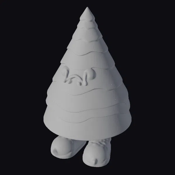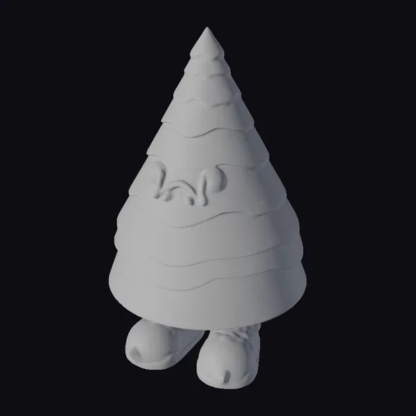 Standing tall with a conical shape, this tree creature boasts layers that resemble the stacked branches of a fir, each one softly glowing with a gentle green light. The face, etched into the tree’s front, sports a cheerful expression, adding to its whimsical nature. Its rosy feet peek out from beneath the layered skirt, suggesting movement and life. The stylized design makes it an eye-catching addition to any festive or fantasy setting. Ideal for use in animations, games, or as a decorative 3D model for printing, this tree creature brings a dash of holiday cheer and fantasy to your projects.