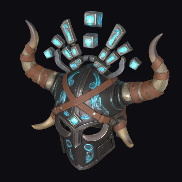 Perched atop a dark metal base, this intricately designed helmet features curved horns that rise like crescent moons, their surfaces wrapped in supple leather straps. The helmet’s faceplate is etched with swirling patterns that dance in the light, while glowing blue gemstones pulse with an otherworldly energy. As the gemstones seem to hover above the helmet’s crest, they cast an ethereal glow on the surrounding surface. This stunning piece of armor would be perfect for adding a touch of dark fantasy to games, animations, or 3D renderings.