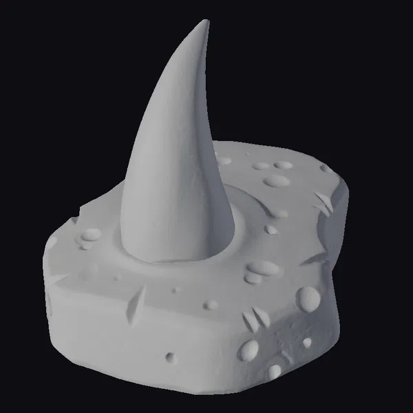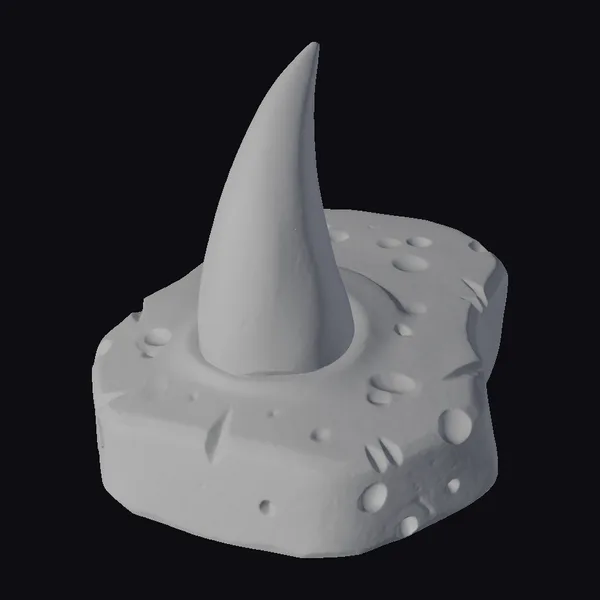 Positioned dynamically on a rugged, irregularly shaped stone base, the horn rises prominently, its pointed tip reaching upwards. The base features a mix of smooth and rough textures, with visible bumps and indentations that suggest age and wear. The horn itself has a subtle gradient effect, transitioning from a lighter shade at the tip to a softer, creamier color towards the base. When viewed from different angles, the glow emanating from the horn seems to shift and pulse, as if imbued with a life of its own. This captivating model would be perfect for use in games, 3D printing, VR/AR experiences, animation projects, or design visualizations where a touch of mysticism and ancient lore is desired.