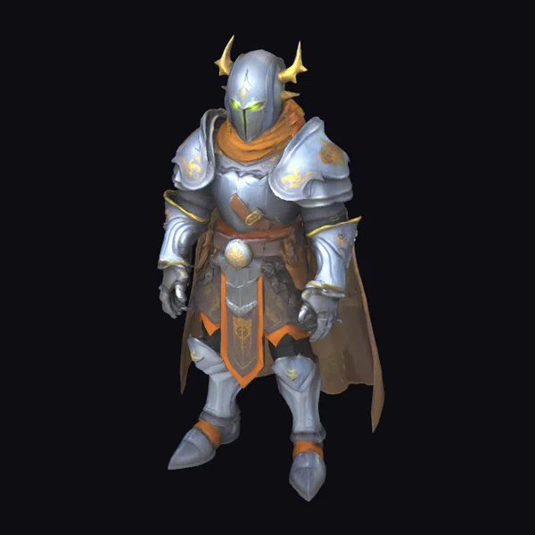 In a majestic pose, this knight stands tall, its armor a testament to the fusion of fantasy and medieval design. The silver plates, adorned with golden accents, glisten with a subtle sheen, while the orange scarf and belt add a pop of vibrant color. The glowing green eyes seem to pulse with an inner light, as if the knight is imbued with mystical energy. This 3D model is perfect for games, animation, or 3D printing, offering a unique blend of fantasy and realism. The intricate details, from the spiky shoulder guards to the flowing cape, make this model a standout addition to any project.