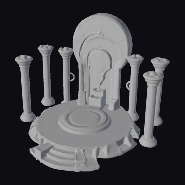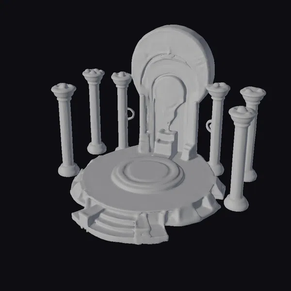 Positioned at the center of a mystical circle, the altar’s base shimmers with a cyan glow, surrounded by a series of pillars that amplify its ethereal presence. The central structure features a large, circular portal etched with runes that seem to hold secrets of the cosmos. As light dances across its surface, the obsidian-like material appears almost liquid, adding to the altar’s enigmatic allure. This 3D model is perfect for projects requiring a blend of ancient mysticism and futuristic technology, such as game environments, sci-fi animations, or virtual reality experiences.