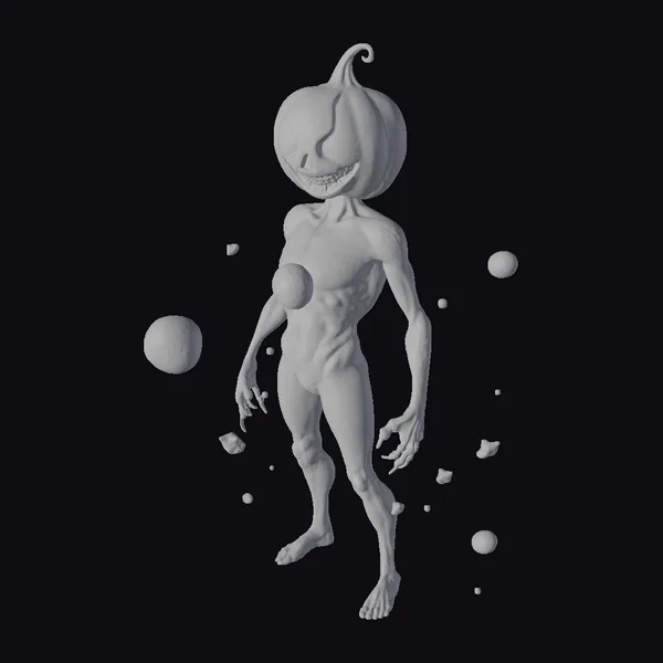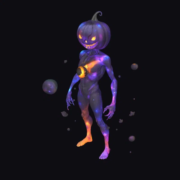 In a majestic pose, the Cosmic Pumpkin Guardian towers with its pumpkin head held high, a twisted, gnarled stem curling from the top like a dark, organic antenna. The humanoid’s body is a mesmerizing blend of purple, blue, and orange, with a swirling, cosmic pattern that evokes the mystery of the galaxies. Glowing yellow eyes seem to pierce through the darkness, while a cylindrical, golden object protrudes from its chest, pulsing with an inner light. Surrounded by floating debris, this fantastical creature exudes an aura of mystique and foreboding. Its unique blend of Halloween spirit and cosmic wonder makes it an ideal addition to games, animations, or VR/AR experiences seeking a touch of the extraordinary.