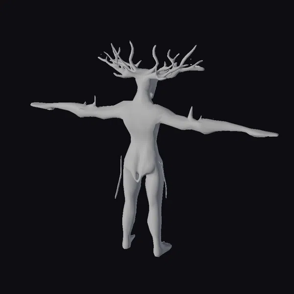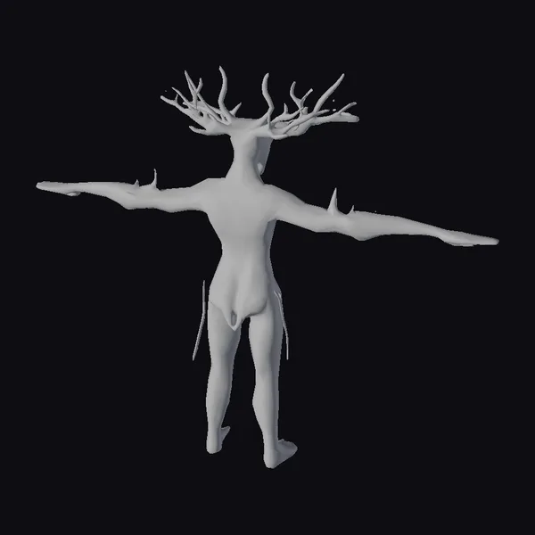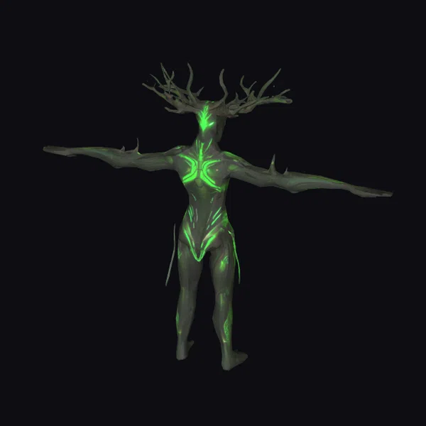 Standing with arms outstretched, this humanoid figure showcases a body covered in a texture that mimics reptilian skin, complemented by intricate, glowing green circuits that pulse with an otherworldly energy. The head is crowned with antler-like protrusions, adding to its mystical aura. The lowpoly aesthetic lends a modern, stylized feel to the creature, making it a standout in any digital environment. Its design suggests a being of great power and mystery, suitable for a variety of applications including games, animation, and virtual reality experiences.