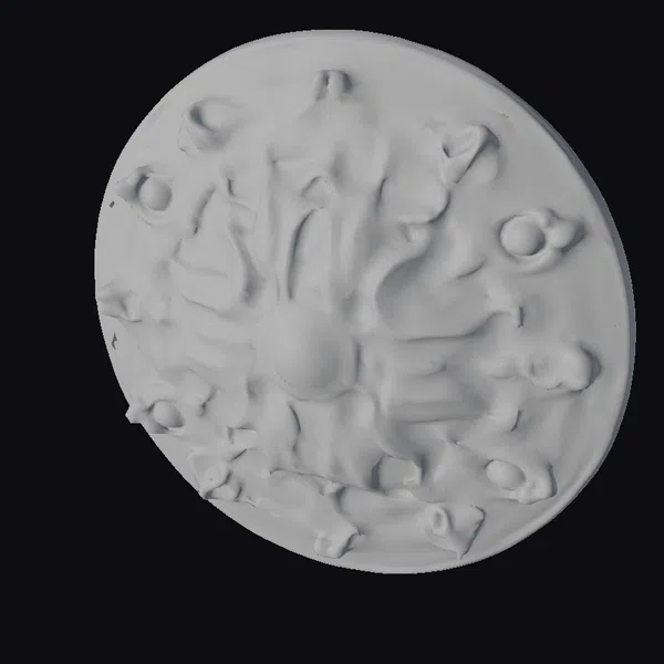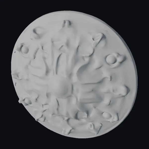 This intricately designed plaque features a metallic silver base with a dark, almost organic center, surrounded by glowing orange accents that seem to pulse with an otherworldly energy. The outer rim is adorned with a series of raised, curved details that add to the overall sense of mystique. The plaque’s glowing elements evoke a sense of advanced technology, making it perfect for sci-fi enthusiasts and fans of futuristic design. Its unique blend of dark, metallic tones and vibrant orange hues makes it a standout piece for any setting, from gaming environments to 3D animations.