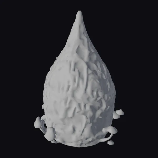 Perched on a subtle base, the teardrop-shaped building rises to a sharp point, its surface a complex network of interconnected, oval-shaped sections. These sections are infused with radiant, glowing veins in shades of blue, purple, and emerald, creating an otherworldly effect. The model’s base is encircled by small, delicate mushrooms, adding a touch of whimsy and organic growth. The texture of the building’s surface blends metallic and biological elements, suggesting a fusion of technology and nature. Ideal for use in sci-fi and fantasy projects, this model can enhance scenes in games, animations, and virtual reality experiences, offering a unique blend of futurism and mysticism.