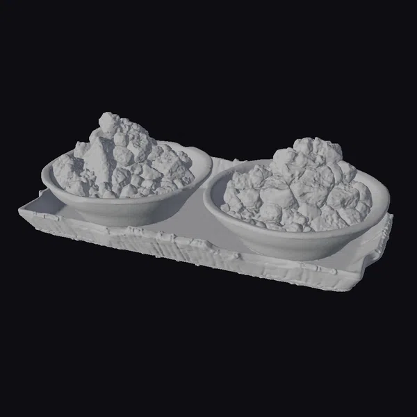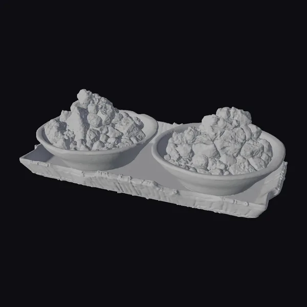 Rendered in exquisite detail, the two black metal bowls sit atop a matching tray, each overflowing with an assortment of dark gray-black uranium ore stones. The stones’ rough, rocky texture is accentuated by a soft, green phosphorescent glow that seems to emanate from within. The bowls and tray appear made of a dark, shiny metal, adding a sense of industrial realism to the scene. The combination of the eerie glow and the rough, rocky texture creates a captivating visual contrast. Ideal for use in scientific or industrial applications, such as 3D modeling, animation, or design projects, this model is sure to add a touch of realism and intrigue.