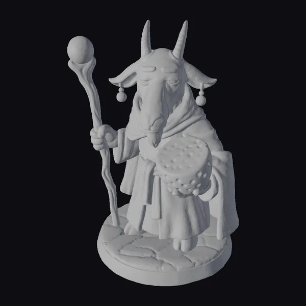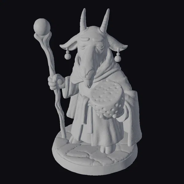 The goat sorcerer figurine stands majestically on a sturdy base, its purple robe flowing with intricate folds and an orange sash cinched at the waist. The sorcerer’s staff, topped with a radiant yellow orb, contrasts with the earthy tones of the base, while the wheel of cheese in its hand appears almost edible. The earrings dangling from the goat’s ears add a touch of whimsy. This fantastical creature is perfect for adding a dash of magic to games, animations, or 3D environments. Its detailed textures and pose make it an excellent choice for designers seeking unique characters.