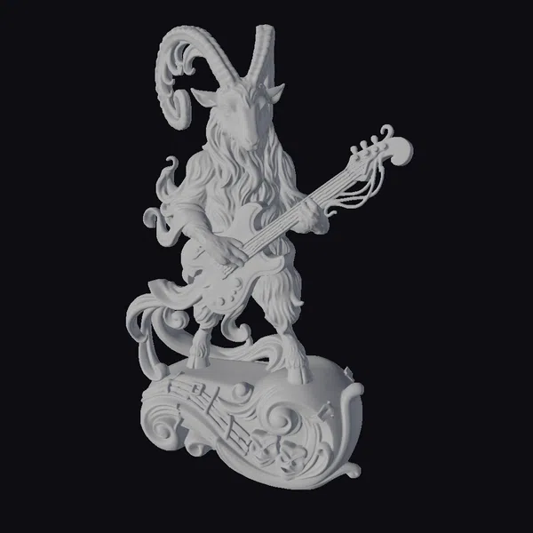 In a dynamic pose that exudes musical energy, a goat with intricately detailed horns and a shaggy coat plays a uniquely designed guitar. The instrument and the goat’s base are adorned with ornate, swirling patterns that add a sense of movement and artistry. The entire sculpture is rendered in a rich, bronze finish, capturing the essence of fantasy and music. The goat’s expression is calm, focused on the music. This model is perfect for projects requiring a mythical, creative vibe, such as animations, games, or fantasy-themed designs.