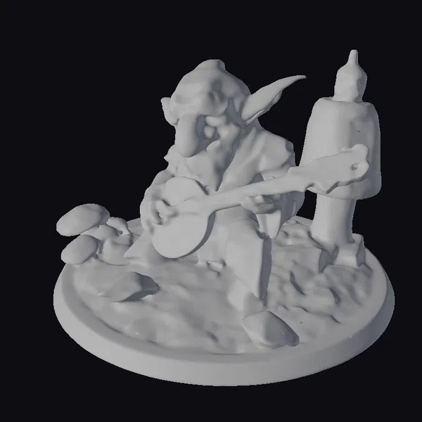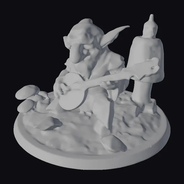 In a serene outdoor setting, a goblin sits comfortably on a moss-covered stump, its pointed ears perked up as it skillfully plays a lute. The goblin’s green skin has a slightly rough texture, and its facial features are accentuated by a few wrinkles, giving it a charmingly aged appearance. The lute, with its light-colored body and reddish-brown neck, seems to glow in the soft, natural light. The base of the scene is adorned with several orange mushrooms, adding a pop of color to the earthy tones of the stump and the goblin’s clothing. This model is perfect for use in games, animations, or 3D printing projects that require a whimsical, fantasy element. Its detailed design and expressive pose make it an excellent addition to any fantasy-themed project.