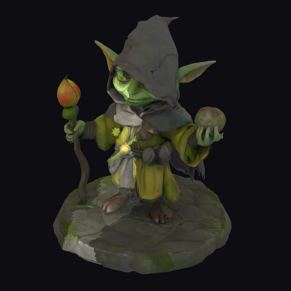 Standing proudly on a circular stone base adorned with patches of moss, the goblin wizard strikes a confident A-pose. The intricate details of its green skin, the texture of the robes, and the weathered appearance of the staff and orb are rendered in high definition. The model showcases exceptional craftsmanship, from the soft folds of the cloak to the sharp, pointed ears. The goblin’s attire is a mix of earthy tones and vibrant green, suggesting a deep connection to nature and magic. This model is perfect for use in games, animations, or as a detailed miniature for collectors, offering a rich blend of fantasy and mysticism.