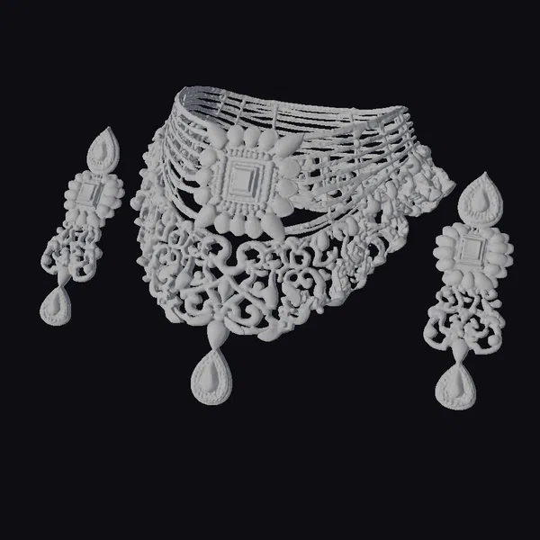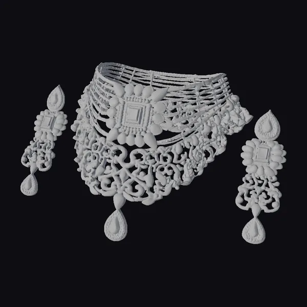 Positioned against a crisp white backdrop, the jewelry set’s golden framework gleams with a warm, sun-kissed tone. The necklace boasts an elaborate design, with a central square motif encircled by pointed petals and a teardrop-shaped ruby at its core. Delicate filigree patterns dance across the surface, punctuated by sparkling red gemstones. Matching earrings feature a similar design, with a teardrop-shaped stone at the apex, a floral motif, and a trailing filigree drop. This stunning set is perfect for adding a touch of luxury to games, 3D print projects, VR/AR experiences, animations, or design concepts. Its intricate details and vibrant colors make it an eye-catching addition to any creative project.