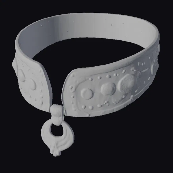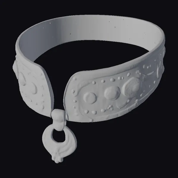 Crafted with meticulous attention to detail, this gold collar features a smooth, rounded band that opens at the front, secured by a hinge mechanism. The collar’s surface is adorned with intricate textures and embellished with numerous diamonds, adding a touch of extravagance. A dangling charm, similarly decorated, adds a playful element. The collar’s design is a blend of modern luxury and timeless elegance, making it perfect for high-end jewelry designs, fashion projects, or as a statement piece in 3D modeling and animation.