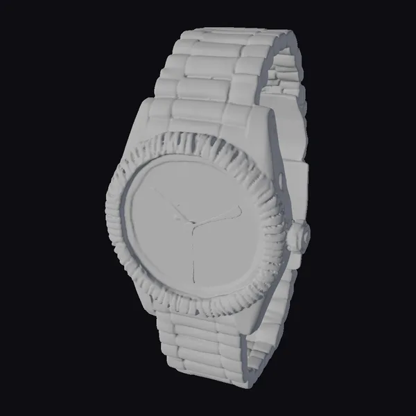 Positioned at a slight angle, the gold luxury timepiece boasts a meticulously crafted metallic body and band, adorned with a white face that gleams with subtle reflections. The watch features gold-tone hands and hour markers, along with a date display at the 3 o’clock position, all set against a crisp white background. Its detailed texture and shiny surface reflect light, highlighting the precision and luxury embodied in its design. Ideal for use in games, 3D printing, VR/AR experiences, animation, and design projects, this model brings a touch of sophistication and realism. The watch’s realistic appearance makes it perfect for projects requiring a high-end accessory.
