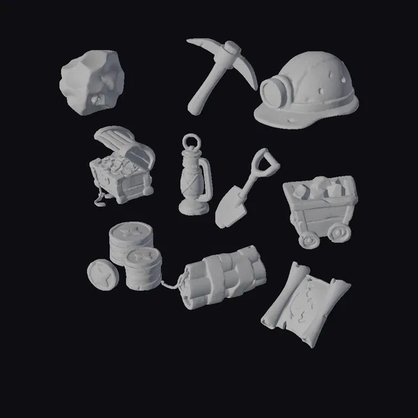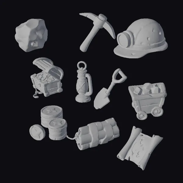 Step into the world of gold rush fever with this set of 10 intricately designed 3D slot symbols. The collection boasts a range of mining-themed icons, each with its own unique character. The gold nugget glistens with a warm, sun-kissed glow, while the pickaxe and shovel display worn, rusty textures. The miner’s helmet shines with a bright headlamp, and the treasure chest overflows with glittering gold coins. A lantern casts a warm light, and a mine cart is filled with rough-hewn stones. The coins and dynamite add a pop of color, while the treasure map appears worn and aged. These symbols are perfect for use in games, 3D printing, VR/AR experiences, animation, and design projects, offering a touch of rustic charm and whimsy.