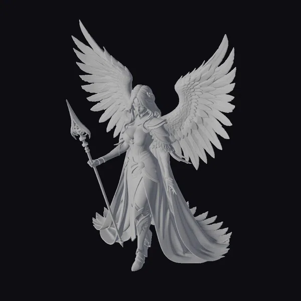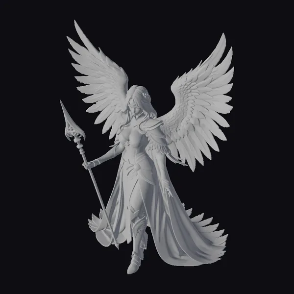 Rendered in exquisite detail, this golden angelic warrior boasts an impressive stance, with her weight shifted onto one leg and her spear at the ready. The gold armor glistens with a subtle sheen, complemented by the delicate texture of her white wings, which appear both strong and serene. Her facial features are finely crafted, with a determined expression that speaks to her unwavering resolve. The long, flowing cape and hair add dynamic movement to the model, even in a static pose. Ideal for use in games, animation projects, or 3D printing, this model brings a touch of divine power to any scene.