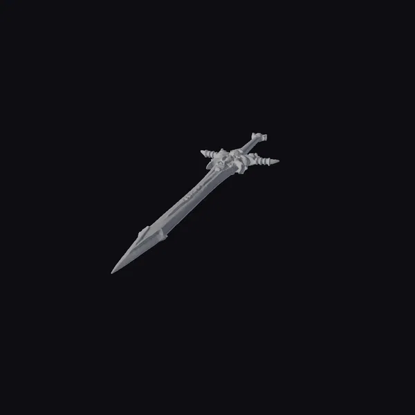 Perched dynamically on a stark white background, the sword’s golden blade commands attention with its sharp point and subtle gradient from golden at the base to a fiery red towards the tip. The hilt, wrapped in black, is adorned with golden accents that spiral and twist in organic, almost mythical patterns. Small, vibrant purple gems are embedded near the guard, adding a pop of color and mystique. The guard itself is a marvel of intricate design, with multiple points and curves that suggest both protection and offense. This sword is not just a weapon; it’s a statement piece, perfect for games, animation projects, or as a striking 3D print. Its detailed textures and balanced proportions make it suitable for close-up shots or dynamic scenes.