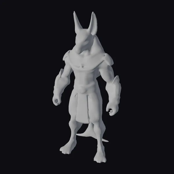 Rendered in exquisite detail, the golden statue of Anubis, the Egyptian god of death, stands proudly with a muscular physique and jackal-like features. The intricate textures of the golden armor, complemented by blue accents, catch the light, suggesting a rich history. The figure’s pose, with its weight shifted slightly to one side, conveys a sense of readiness. The blue gem on the belt buckle adds a pop of contrast against the gold. This model is perfect for projects requiring a touch of ancient mythology, such as games, animations, or architectural designs that seek to evoke a sense of timelessness and mystique.