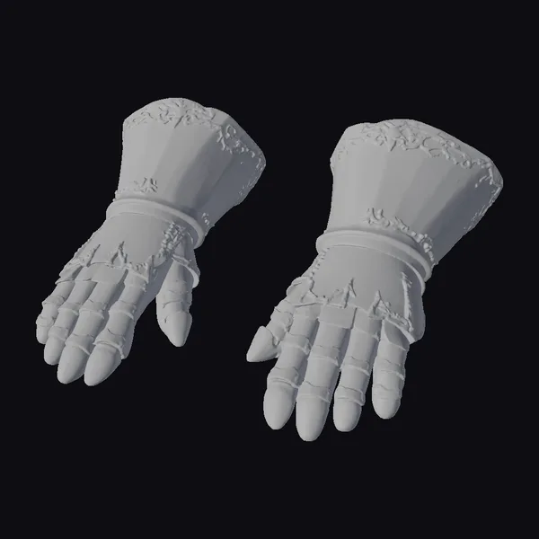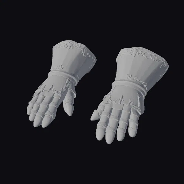 Rendered in exquisite detail, these golden armored gauntlets are a marvel of fantasy design. The gray metallic base provides a sturdy backdrop for the lavish gold filigree that adorns the cuffs and fingers, creating a striking contrast that catches the eye. The fingers, capped with sharp, pointed tips, are segmented to mimic the flexibility and articulation of real hands, while the palms and cuffs boast a more solid, armor-like construction. The gold accents are meticulously crafted, featuring intricate patterns that add a layer of realism and depth to the overall design. These gauntlets are perfect for projects requiring a touch of medieval fantasy, such as game development, animation, or architectural visualization. They can be used to equip characters, enhance environments, or serve as standalone decorative pieces.
