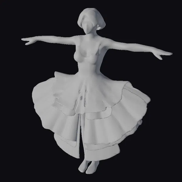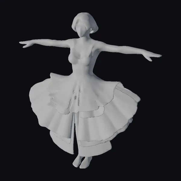 In a majestic pose, the golden ballerina stands out against a plain backdrop, her white hair styled in a chic bob. Her dress, a masterpiece of layered tulle, flows around her with a life of its own, showcasing a gradient of golden tones that seem to shift with every movement. The model’s arms are outstretched, as if caught in a serene dance. Her facial features are delicately rendered, with a subtle smile playing on her lips. This 3D model is perfect for projects requiring a touch of elegance and dynamism, such as animations, games, or architectural visualizations. Its stylized appearance allows it to blend seamlessly into fantasy or modern settings.