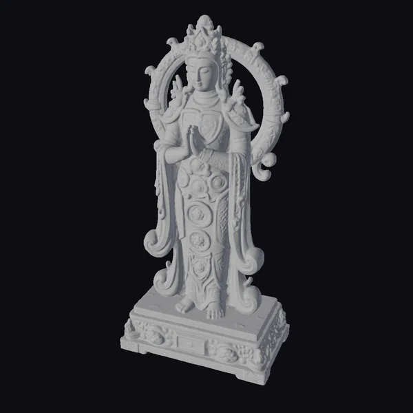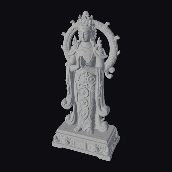 Positioned on a square base adorned with scroll-like designs, the statue showcases a serene Buddhist deity with a crown atop its head, signifying its divine status. The deity’s robe is richly detailed with circular motifs, and its hands are pressed together in a gesture of prayer or meditation. The halo, decorated with small spheres and curved lines, frames the deity’s face, emphasizing its tranquil expression. The entire piece is bathed in a warm, golden hue, suggesting it could be made of bronze or brass. This model is perfect for use in games, 3D printing, VR/AR experiences, animation projects, or as a detailed design reference. Its high level of detail, from the texture of the robe to the serene facial expression, makes it a valuable asset for creators looking to add depth and authenticity to their work.