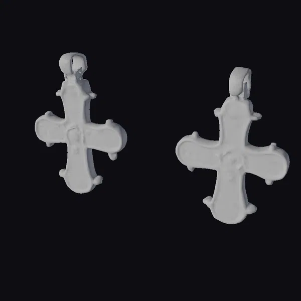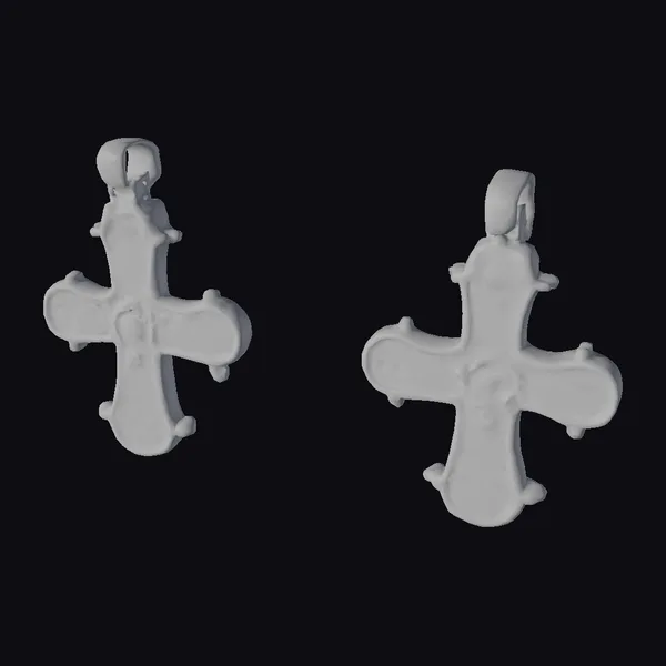 Positioned dynamically against a pristine backdrop, the golden Byzantine cross pendant showcases its ornate design, with swirling patterns and symbolic motifs meticulously etched into its surface. The pendant’s golden hue glistens with a subtle sheen, inviting the viewer to appreciate its craftsmanship. As a 3D model, this pendant can be utilized in various contexts, such as game development, 3D printing, virtual reality experiences, animation projects, and design visualizations. Its detailed texture and realistic proportions make it an excellent choice for projects requiring authentic ancient-inspired jewelry.