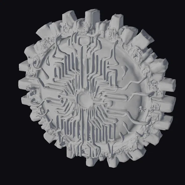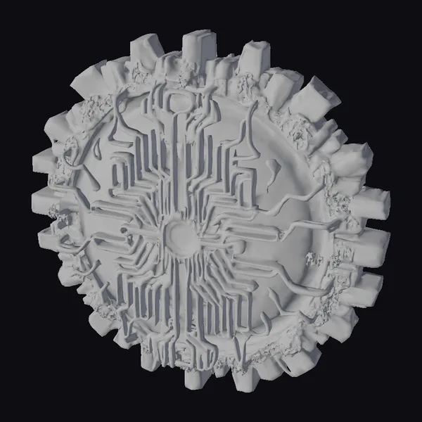 Behold the Golden Circuit Emblem, a masterpiece of sci-fi artistry. This emblem showcases a complex network of golden pathways that intersect and branch out from a central blue circle, adorned with a golden star-like pattern. The golden components exhibit a weathered, metallic texture, while teal accents add a pop of color and contrast. The emblem’s design is meticulously detailed, with sharp edges and clean lines that evoke a sense of high-tech sophistication. The blue center glows with an otherworldly light, drawing the viewer’s eye into the intricate circuitry. This emblem would be perfect for use in games, 3D printing, VR/AR experiences, animation, and design projects where a futuristic, high-tech aesthetic is desired.