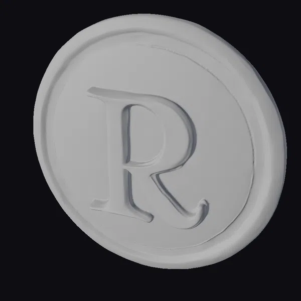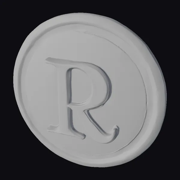 The golden coin model showcases a meticulously crafted design, with the large, embossed letter ‘R’ standing out against a smooth, golden background. The coin’s surface exhibits a gentle sheen, accentuating its realistic appearance. A thin, raised border encircles the central emblem, while a thicker, outer border adds a sense of dimensionality. The model’s level of detail and texture makes it suitable for various applications, including game development, animation, 3D printing, and visual design projects. Its luxurious appearance can add a touch of elegance to any scene or project.