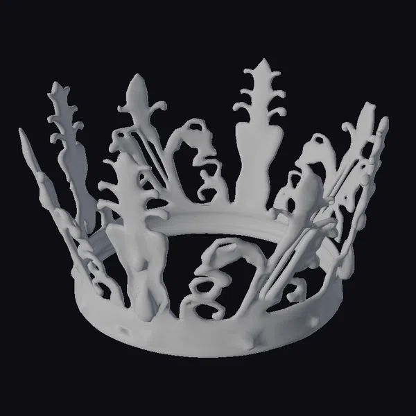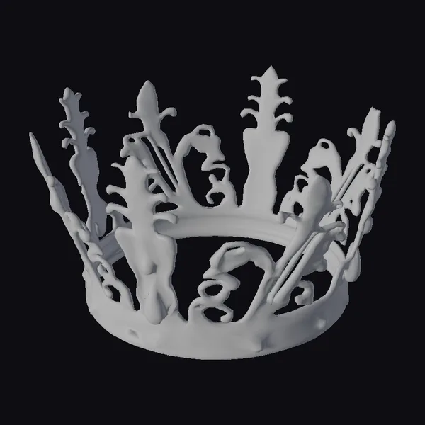 Detailed with precision, this golden crown boasts an ornate design featuring a delicate filigree pattern and sharp, pointed tips. The band is embellished with small, round gems that add a touch of brilliance. The central piece, resembling a fishbone, is a unique feature that sets this crown apart. Its realistic texture and shading give it a lifelike appearance, making it perfect for use in games, animations, or 3D designs where a regal element is needed. The crown’s proportions are well-balanced, ensuring it looks majestic from any angle.