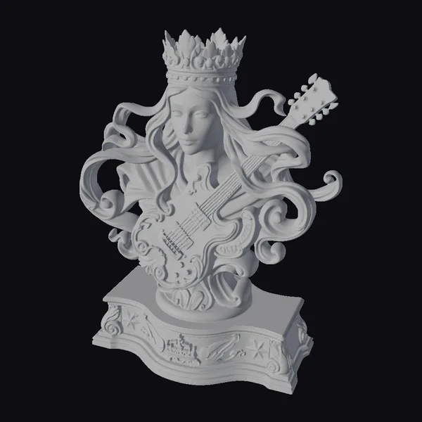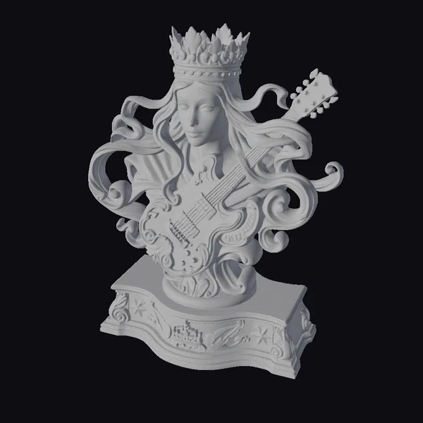 This stunning bust showcases a regal woman with a crown atop her head, her face a picture of serene elegance. Her long, flowing hair merges with the intricate design of a guitar, which she appears to be birthed from. The entire piece is adorned with ornate details, from the golden crown and metallic sheen of the guitar to the base that resembles a mix of wood and precious metals. The queen’s expression is calm, her eyes cast slightly downward, adding to the mystique of the piece. Ideal for fans of music, royalty, or unique art pieces, this model can be used in games, 3D printing, VR/AR experiences, animation, and design projects, offering a touch of stylized realism.