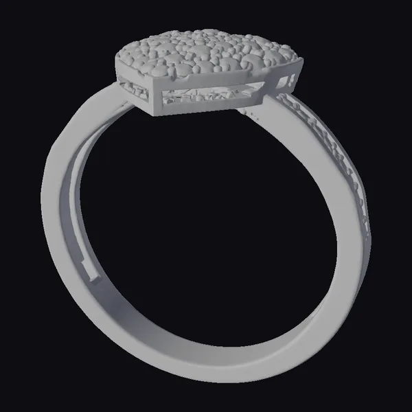 Positioned in a dynamic angle, the golden ring showcases its heart-shaped diamond centerpiece, meticulously encrusted with numerous small diamonds. The band, equally adorned with diamonds on its sides, transitions smoothly into the heart-shaped setting, creating a cohesive and luxurious look. The detailed texture of the gold and the precise setting of the diamonds highlight the exceptional craftsmanship. This 3D model of a golden diamond heart ring is perfect for use in high-end jewelry design, fashion projects, virtual reality experiences, and animation, offering a realistic and detailed representation of luxury jewelry.