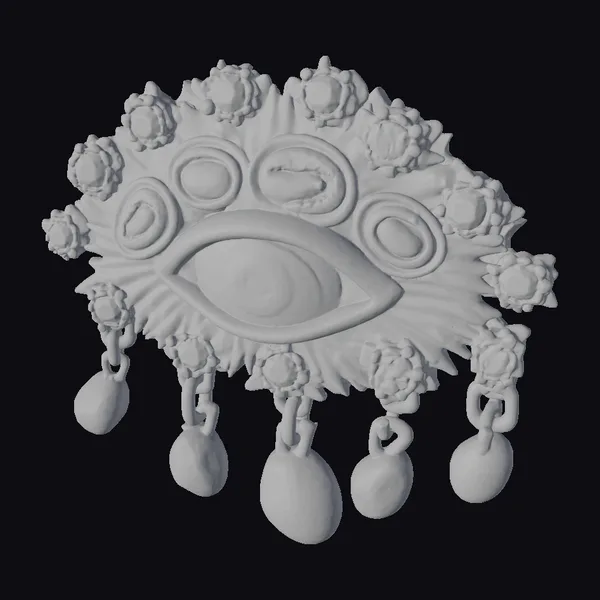 Crafted with meticulous attention to detail, this golden brooch showcases an eye at its center, symbolizing insight and wisdom. The eye is encircled by smaller circular details and surrounded by a halo of gems, adding a touch of opulence. Four dangling chains add a dynamic element to the piece. Ideal for designers looking to add a touch of mystique to 3D projects, animations, or game characters. Its ornate design and luxurious feel make it perfect for high-end fashion projects or fantasy settings.