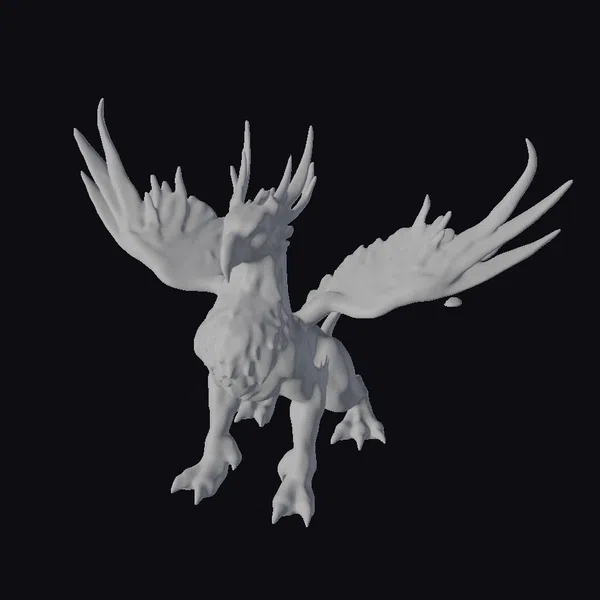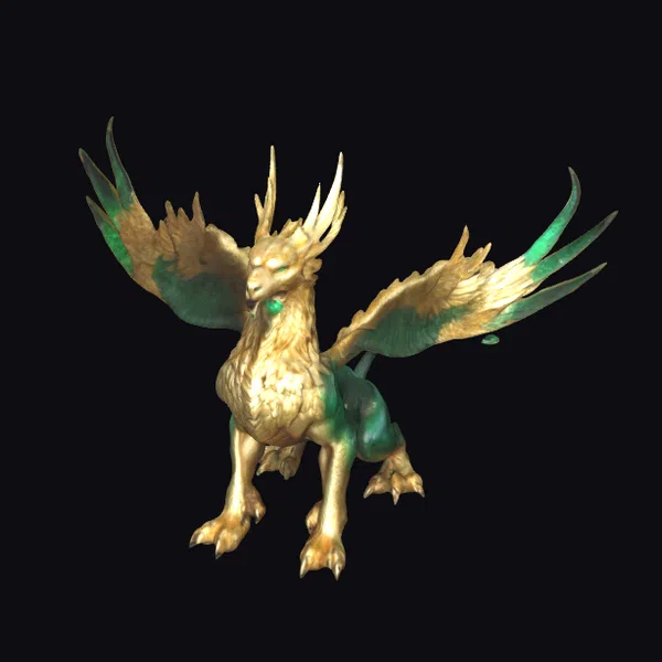 Perched regally with wings outstretched, this mythical creature showcases a harmonious fusion of a lion’s robust physique and the soaring capabilities of an eagle, complete with a radiant golden coat that shimmers under the light. The creature’s sharp, hooked beak and piercing green eyes exude a sense of fierce nobility, while its feathered wings, gradating from gold to deep green at the tips, suggest a mastery of the skies. Crafted with meticulous attention to detail, this model is perfect for projects requiring a touch of fantasy and power, such as game development, animation, or architectural visualization.